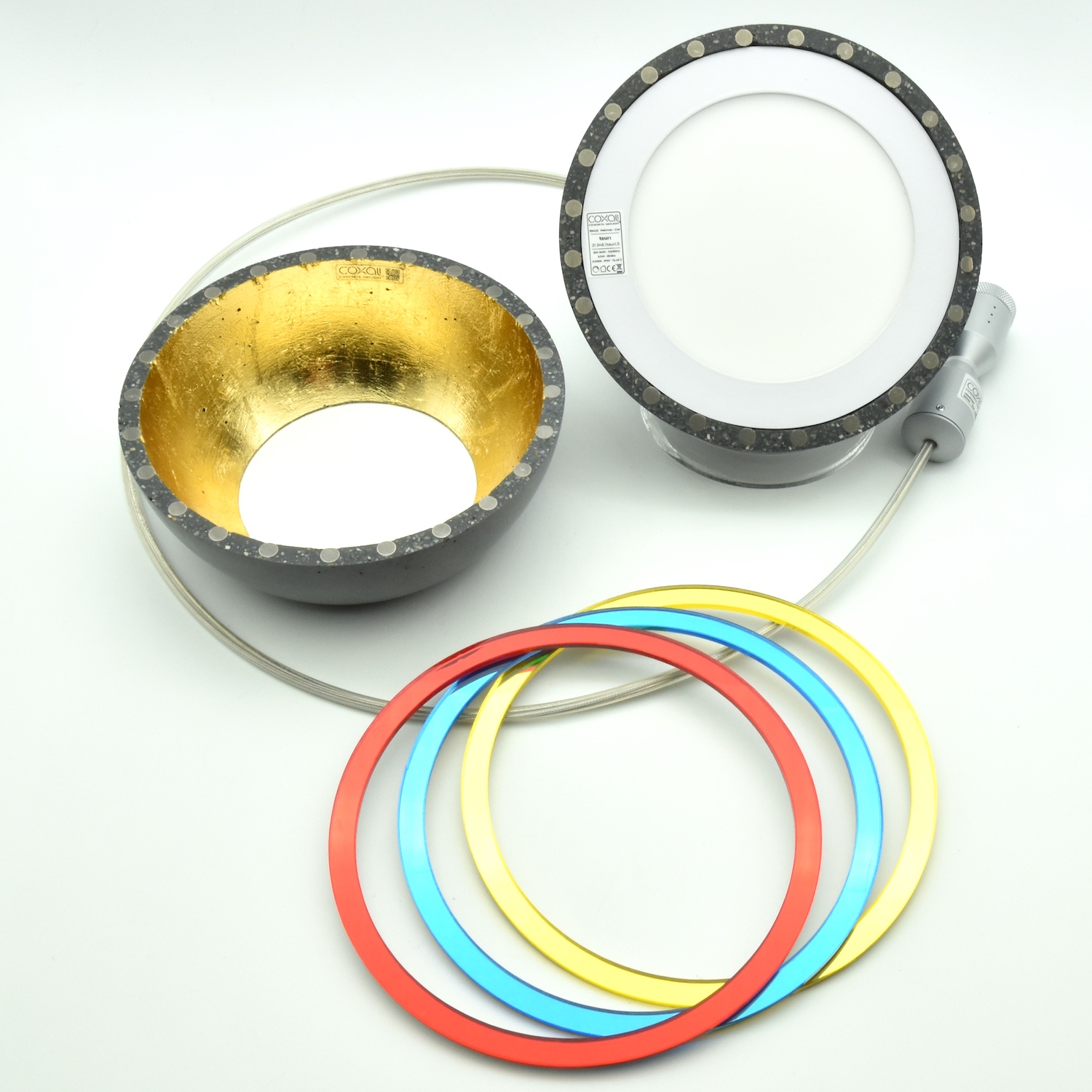 Lieferumfang : 2 Leuchten taurı ⎜Schienensystem anschlussfertig mit Baldachin incl. Decken- & Schienenanschluss ⎜je Leuchte drei transluzente Farbringe